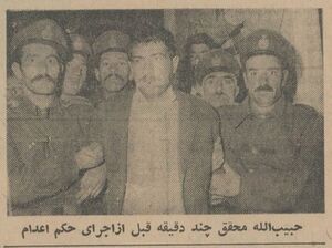 ساعت چهار و سی و پنج دقیقه حبیب الله محقق محکوم باعدام را در حالی که سیگاری زیرلب داشت از سلول زندان خارج کردند و بدفتر زندان آوردند. در آنجا پس از انجام تشریفات و معاینات لازم ، محکوم اظهار علاقه کرد برادرش علی محقق را که بجرم سرقت در زندان است ببیند. مامورین علی برادر محکوم را آوردند و او با مشاهده برادرش در نزدیکی چوبه دار شروع بگریه و زاری کرد. اما محکوم او را دلداری میداد و میگفت برادرجان ، آخر و عاقبت نادرستی و راه کج همین است . من از دنیا میروم ولی تو مواظب رفتار و کردار خود باش بعد از آن دادیار دادسرا و منشی محکمه جنائی حکم صادره را قرائت کرد. و آنوقت از محکوم سئوال شد که اگر وصیتی دارد بگوید. حبیب الله جواب داد وصیتی ندارم فقط خیلی دلم میخواست در انظار مردم بدارم بکشند تا بمردم نصیحت کنم. پس از انجام تشریفات مذهبی در حالی که دستبند و پابند بدست و پای محکوم بود او را بطرف محوطه زندان و پای چوبه دار راهنمانی کردند. ساعت پنج و نیم صبح طناب دار بگردن جنایتکار محکوم انداخته شد و لحظه ای بعد حبيب الله محقق در بالای دار جان سپرد.[۴]